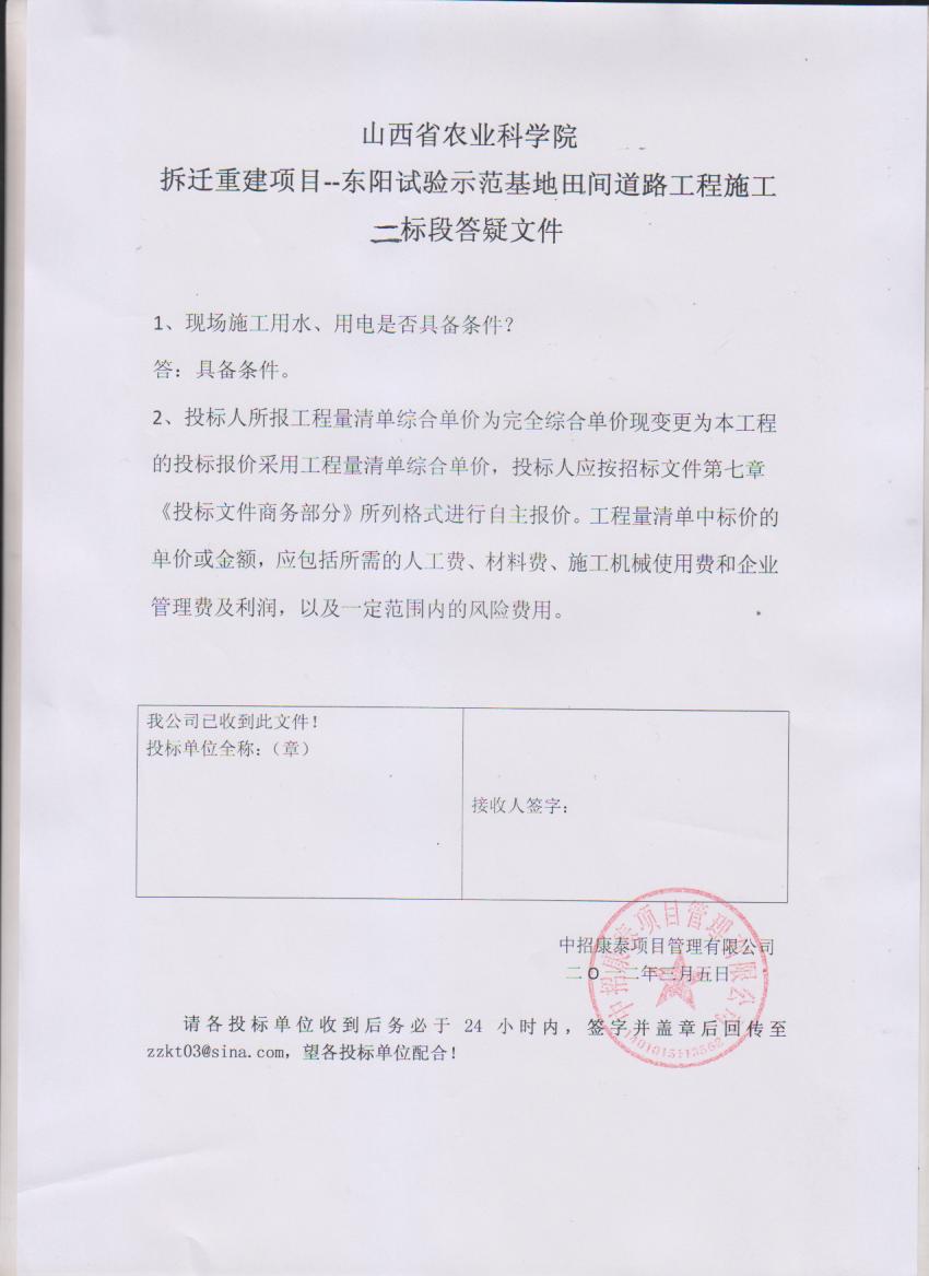 山西省農(nóng)業(yè)科學(xué)院拆遷重建項目--東陽試驗示范基地田間道路工程施工二標(biāo)段答疑文件
