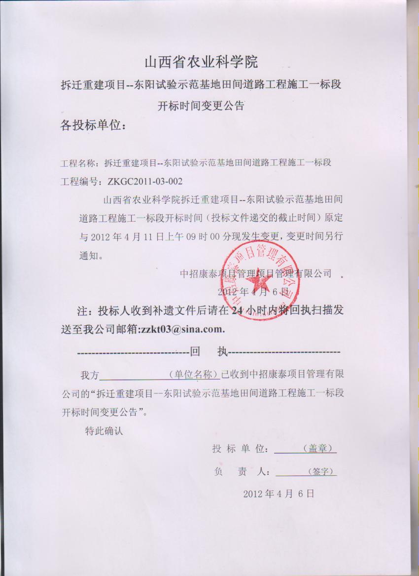 山西省農(nóng)業(yè)科學(xué)院拆遷重建項目--東陽試驗示范基地田間道路工程施工一標段開標時間變更公告